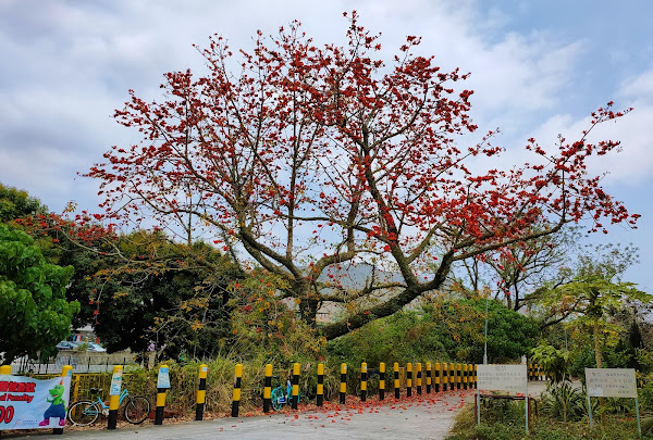 There is a really strange cotton tree (Bombax ceiba) behind the bus shelter in Shui Mei. These trees usually have trunks that are dead straight, like conifers (A Blaze of Glory), but this one is grossly misshapen: